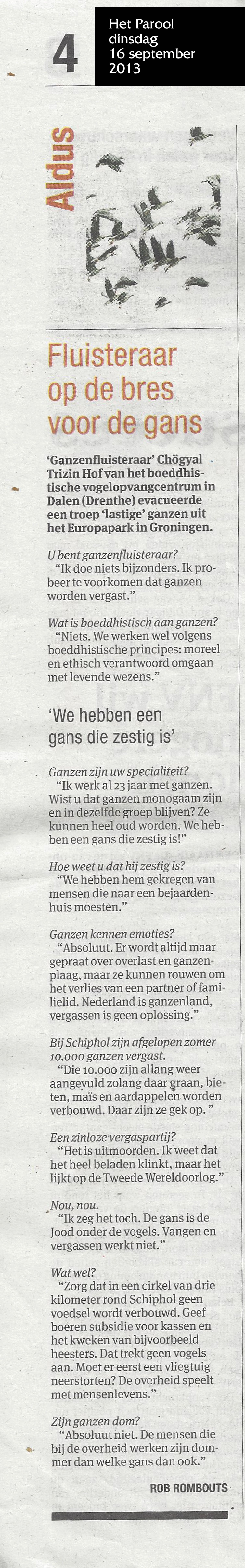 In reactie op het wegvangen van enkele ganzen in Groningen werd Chögyal Trizin Hof geïnterviewd door het Parool. Een kort bondig maar doortastend interview dat krachtig weergeeft waar Ganzenbescherming Nederland voor staat.