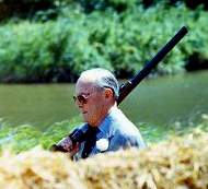 Nederland is een klein landje met een grondoppervlak van slechts 41.426 km2, waarop circa 16.731.000 mensen leven, wonen en werken. Het gros van die mensen draagt dieren een warm hart toe, houdt van de natuur en enquêtes hebben al vele malen uitgewezen dat minstens 80% van de bevolking afkerig staat tegenover het doden van dieren als vorm van tijdverdrijf. Slechts een onbeduidende minderheid van om en nabij de twintigduizend personen kan geboekstaafd worden als hobbyjager en daarnaast zijn er enkele duizenden boeren en grondeigenaren in het bezit van een akte waarmee zij de jacht op eigen terrein bedrijven. Om u een beeld te geven van de leeftijdsopbouw van de hobbyjachtwereld neem ik u mee naar de jachthut van Cartouche bij Speuld (foto 01), waar de nagedachtenis van de vroegere hoofdredacteur van het monomane periodiek De Nederlandse Jager (foto 2) tot een soort bedevaartsoord voor oude en aankomende bejaarden heeft geleid (foto 3) U ziet hier dan ook een dwarsdoorsnede van de leeftijdsopbouw van het ledenbestand van de KNJV, waarin vitale jongeren al even zeldzaam zijn als twee en twintigenders in de Veluwse hertenpopulatie of kapitale keilers in het regionale zwijnenbestand. Want die zijn allemaal bestiaal geoogst om monetair benut te worden (foto 4)! Hobbyjacht heeft namelijk absoluut niets van doen met enige vorm van verantwoord natuur- of faunabeheer en wordt slechts ingegeven door geldingsdrang, frustratie, mannelijk onvermogen, winstbejag (foto 5 en 6) of onbeschaafde moordzucht.