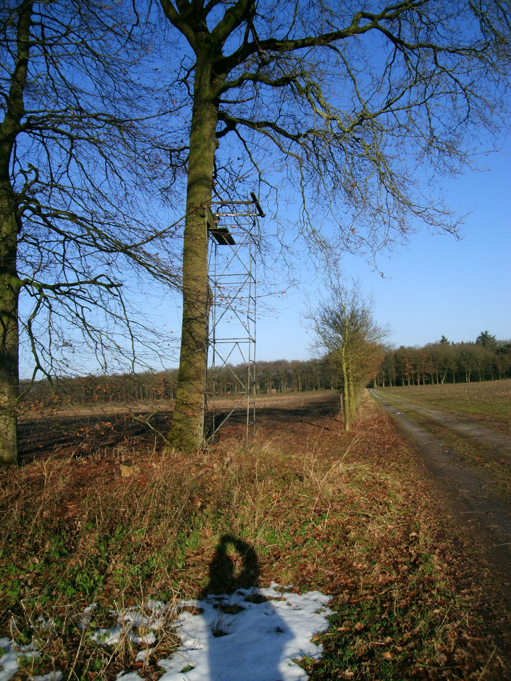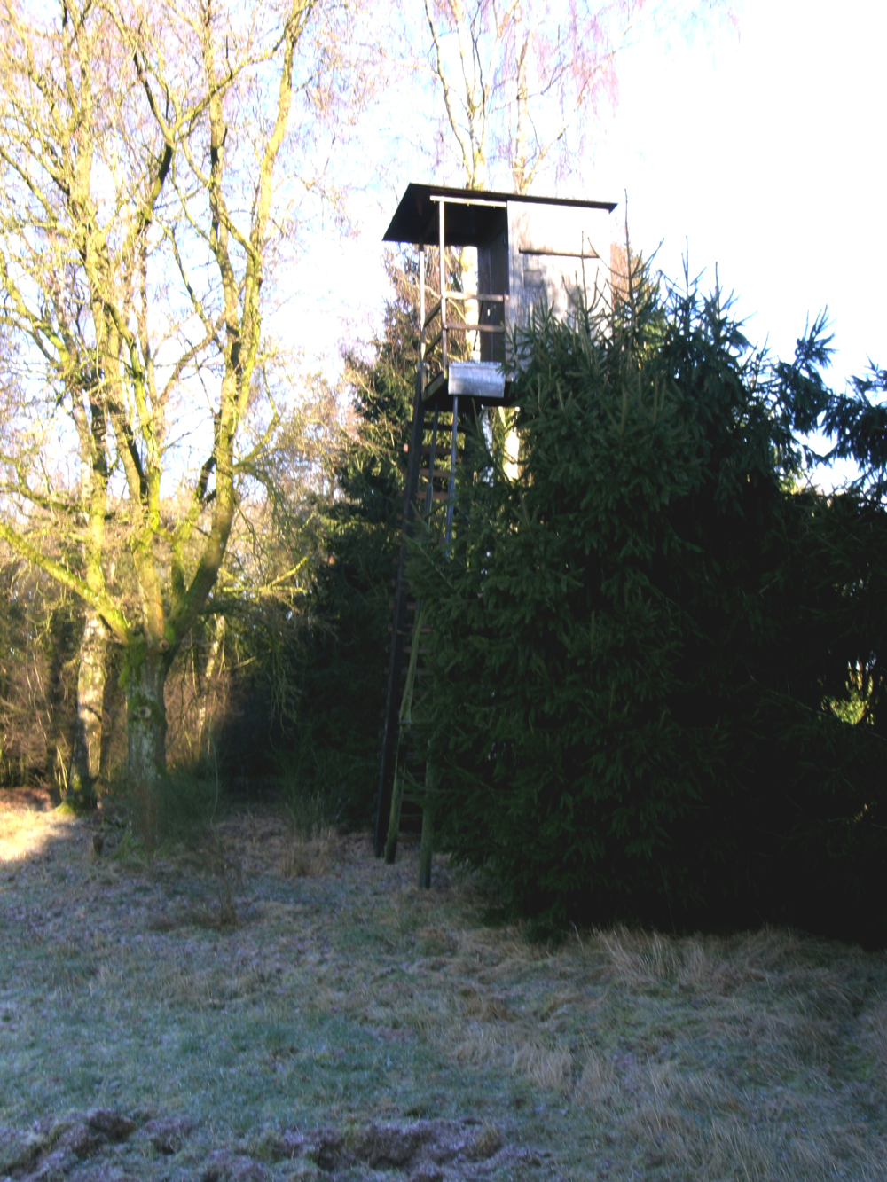 Na dit korte rendez vouz vervolgde ik mijn weg en legde eerst de situatie rond Huis te Leuvenum vast (foto 17), waar aandoenlijke bebording de toegang verbiedt (foto 18) en de kansels oerdegelijk in elkaar zijn getimmerd (foto 19, 20, 21) Ook bevindt zich daar een omrasterd bankje (foto 22) dat met behulp van een camouflagenet simpel is om te toveren tot een schiethut. Er bleek ook nog een gewone mobiele hoogzit te zijn waarvandaan gister, te oordelen aan de verregende sporen, een hert, ree of zwijn is afgeschoten (foto 23).