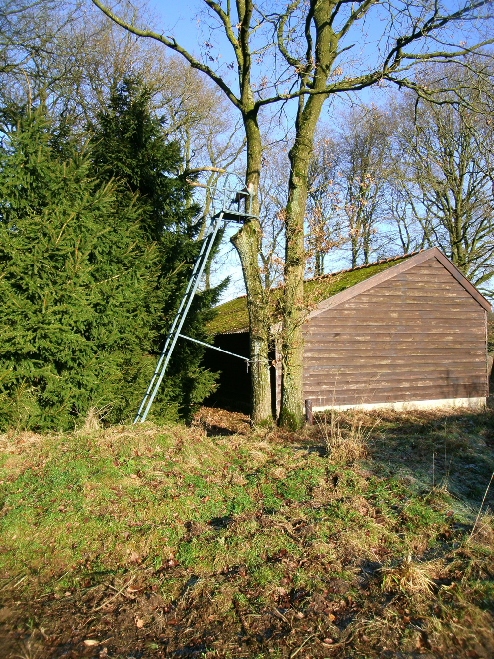 Omdat u in eerdere rapportages al geïnformeerd werd over het grootste jachtrevier van ons land, de 9700 hectaren omvattende Koninklijke Houtvesterijen Het Loo, leek het mij goed om voor dit verslag op zoek te gaan naar een jachtveld van bescheiden afmeting. Puttend uit mijn herinnering reed ik daarom letterlijk van A naar B en startte deze quick-scan bij de ultieme grens van de gemeenten Apeldoorn en Barneveld. Om precies te zijn: op de landerijen achter hoeve Oud - Milligen. Die gronden liggen ingeklemd tussen het militaire oefenterrein Stroesche Zand annex legerplaats Wittenberg en de SBB-objecten Vossen en Maanschoten. Al die omringende terreinen zijn dus eigendom van de Staat der Nederlanden en de door mij uitverkoren landbouwenclave heeft een oppervlakte van slechts circa 60 hectaren. Een erg klein jachtveld dus (foto 1). U vindt de hier besproken jachtlocatie langs de Apeldoornse gemeentegrens tussen de coördinaten 469.5 en 469.8. Via een tankbaan en een open bosrand bereikte ik ongezien dit jachtdomein van mij onbekende jagers (foto 2, 3) en wist al binnen luttele seconden dat de intuïtie me niet bedrogen had. Want aan de rand van een wildweitje dat begrensd wordt door dichte fijnsparrenplantages trof ik niet alleen een gigantische wildkansel aan (foto 4, 5), maar binnen het onbelemmerde schootsveld bleek op ongeveer vijftig meter afstand een houten voertrog te staan, die gevuld was met maïskorrels (foto 6). Dergelijke kapitale bouwsels staan model voor een verboden vorm van jachtjolijt: het tegen betaling gelegenheid bieden tot afschot, beter bekend als invitatiejacht. Achter deze kansel ligt een sparrenbosje en direct daarachter trof ik een tweede voertrog aan en tevens een liksteen voor roodwild (foto 7,8).