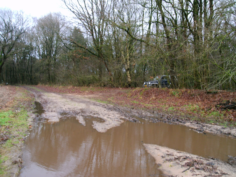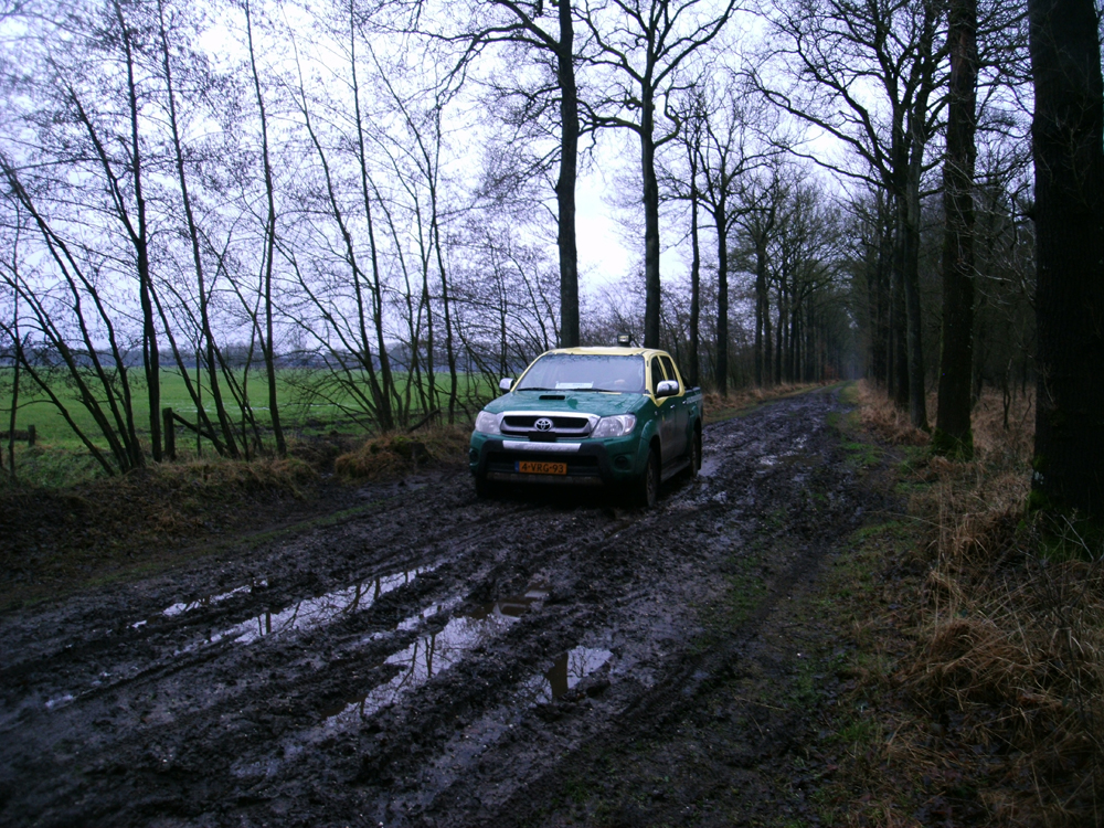 Het aangrenzende natuurgebied is eigendom van Staatsbosbeheer en daar werden geen sporen van jagersactiviteiten aangetroffen. Of dat ook het geval is in het westelijke gedeelte van het Garderensche Veld dat eigendom is van Het Geldersch Landschap waag ik te betwijfelen, maar omdat daar een cyclocross bleek te zijn uitgezet werd besloten om dat gebied op een later tijdstip te gaan doorvorsen. Daarom werd de zoektocht voortgezet bij de veronderstelde beverdam, waar de valkuil was afgedekt met takken en er maïskorrels, oud brood en houtspaanders gestrooid bleken te zijn. Dat lijkt op kwajongenswerk. Toch blijft de beveroptie nog open omdat de locatie niet ver verwijderd is van het Veluwemeer en er in 2010 enkele bevers zijn ontsnapt uit Natuurpark Lelystad. Omdat gehouden en/of in gevangenschap geboren bevers takhout en stammetjes krijgen aangereikt zullen zulke dieren zich in vrije staat anders gedragen dan wilde soortgenoten. In het bos graasden minstens vijf kapitale herten en er scharrelde een vos rond, maar net als bij voorgaande bezoeken was er geen tastbaar spoor van bevers te bekennen. Omdat deze zaak mij al van meet af aan intrigeert, besloot ik er werk van te maken en ging op zoek naar boswachter Gert Verwoerd. Ik schatte de kans om hem te vinden hoog in, want zoveel wegen zijn er niet op landgoed Staverden en met het oog op de acties van het Groen Front verwachtte ik hem dicht bij de plaatsen waar ik een jachthuttenconcentratie veronderstelde.