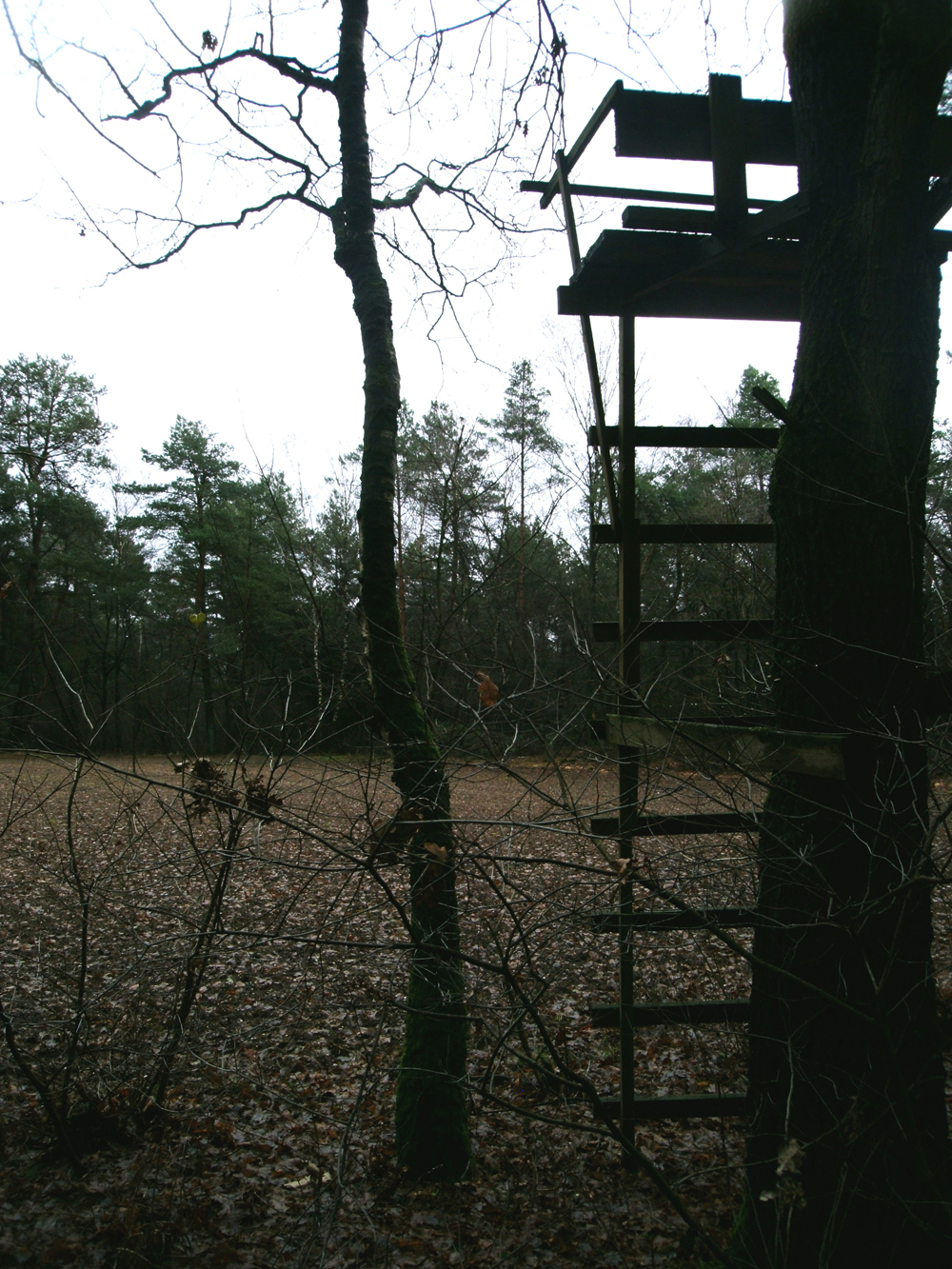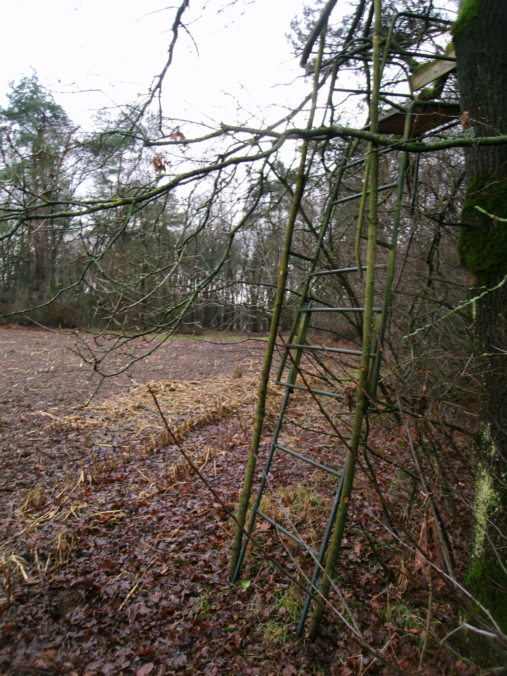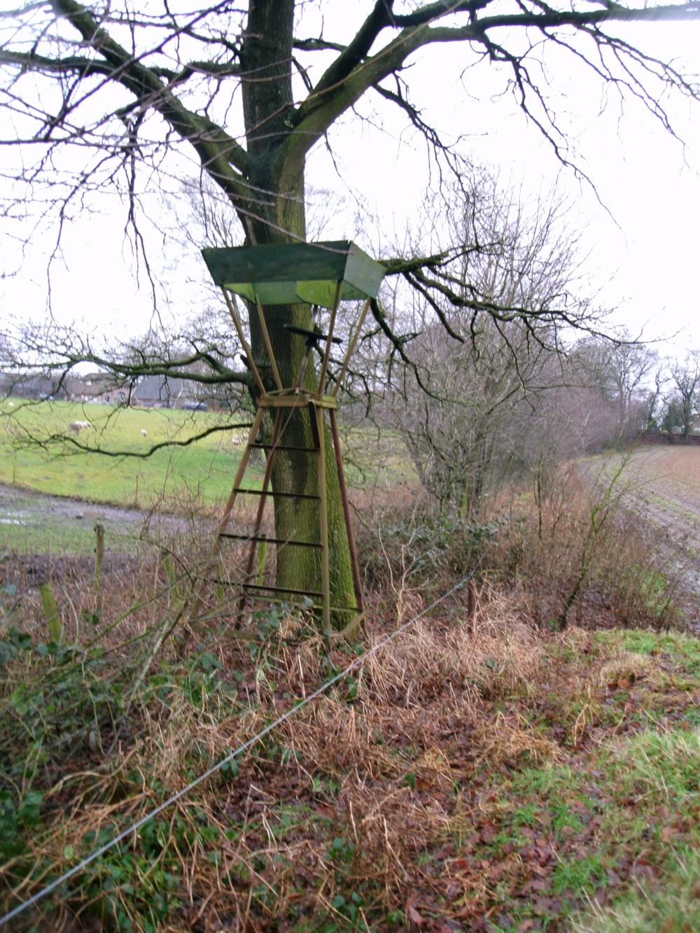 Na de geslaagde kanselsurveillance van 11 december jl. leek het mij goed om de draad weer op te pakken in het bos- en heidegebied ten oosten van Ouwendorp (foto 1) waar het open akker- en weideland wordt begrensd door particulier bezit. Zoals gebruikelijk werd de auto zoveel mogelijk aan het zicht onttrokken (foto2) en al binnen een kwartier waren er in dit vrij toegankelijke terrein drie kansels en een hut getraceerd (foto 3,4,5,6) die geen van allen een kapitalistische aanblik boden (foto 7). Een in het bos aanwezige schrikdraadafrastering(foto 8) bleek enkele wroetend rondscharrelende en opdringerig -vriendelijke Bentheimer Bonte beren in toom te moeten houden. Ook al geen alledaagse ontdekking (foto 9), waarvan we mogen aannemen dat zij niet als jachttrofee voor slecht ziende nimrods bedoeld zijn. Want heus: ik kijk nergens meer van op!