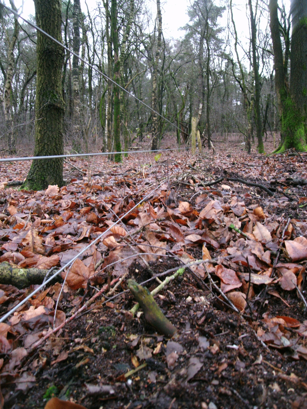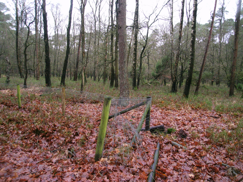 Al meteen na het verlaten van de Oude Zwolsche Weg en lopend in de richting van de landbouwenclave Leuvenum, bleek er van alles mis te zijn met het wildkerende raster (foto 10, 11), dat op deze manier natuurlijk zin en functie verliest. Ook hier bleek er in het bosgebied en wirwar van wildwissels aanwezig te zijn (foto 12), waarbij sommige het raster kruisten. Herten en reeën passeren daar het amper een meter hoge gaas met een simpel sprongetje, terwijl er voor de zwijnen poortjes in het hekwerk zijn aangebracht (foto 13). Leverancier Arfman uit Holten wordt er stinkend rijk van, maar al dat peperdure rasterwerk is op deze manier natuurlijk volstrekt zinloos. Het percentage van die kosten dat uit gemeenschapsmiddelen is betaald, zou dan ook subiet teruggevorderd behoren te worden.