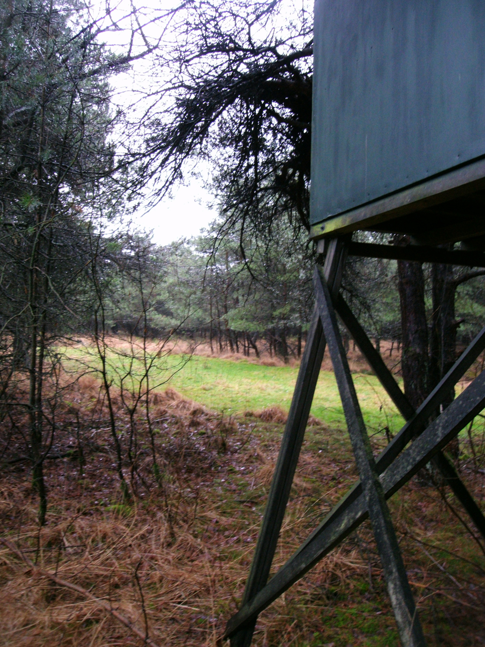 Dit gezegd hebbende viel het op, dat notoire afschotkansels die zich op goed in het oog vallende plaatsen bevinden, zijn voorzien van de misleidende tekst 'wildobservatie-hoogzit'(foto 16). Deze vorm van list en bedrog valt natuurlijk geen enkele argeloze wandelaar op, maar zet een alerte misstandenjager meteen op scherp. Want hoewel de grofwildjacht, dankzij de ruimhartige doch levensgevaarlijke semiautomatische geluiddempergeste van minister Ivo Opstelten en commissaris Clemens Cornielje (kortweg: dankzij de VVD!), allang niet meer uitsluitend vanaf vaste kansels plaatsvindt, zijn luie jagers nog altijd niet van die staketsels af te branden. Daarom staan er ook nog minstens zeven van zulke hoogzitten verspreid door het gebied (foto 17, 18, 19), die men 'vergeten' is op de wandelkaart aan te geven.