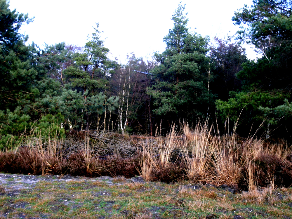 Via het door een vergrendelde slagboom geblokkeerde bospad dat naar de voor publiek afgesloten Hessenweg leidt, werd de rand van de open heide bereikt. Andermaal werden de verse sporen van terreinbanden in het natte zand gevolgd, die naadloos naar het sluitstuk van deze dag bleken te voeren. Ter hoogte van commandopost Domweg rende in de bosrand een geschrokken keiler weg van een omgewoeld open veldje, dat bezaaid bleek te liggen met uitgestrooide maïskorrels in het schootsveld van een verrijdbare kansel (foto 12, 13, 14). Te oordelen naar de staat waarin het materieel verkeert, wordt er hier al erg lang op deze bij wet verboden manier aan hobbymatig afschot gedaan. Dat spoorzoeken werkelijk loont bleek opnieuw toen er aan de rand van de heide ter hoogte van de Ottenweg een hut werd ontdekt, die gemakkelijk als militaire observatiepost versleten zou kunnen worden. Die hut geeft uitzicht op de zandige flank van de licht glooiende bosrand, waar eveneens kwistig met maïs gestrooid wordt (foto 15, 16, 17). Aan het slot van deze wandeling werd bij het begin van het Smitpad nog een met netten en takken gecamoufleerde jachthut aangetroffen (foto 18). Vanaf dat punt voerde het verse bandenspoor verder naar het in de heide uitspringende bosgebied beoosten de Looweg, maar helaas ontbrak te tijd om ook daar de ongetwijfeld aanwezige strafbare feiten vast te leggen.