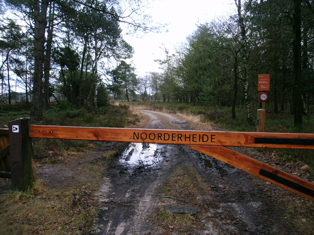 Sinds de Staat der Nederlanden in 1983 het landgoed Noorderheide in eigendom verwierf en het beheer ervan toevertrouwde aan Staatsbosbeheer, lijkt er op het eerste gezicht niet veel veranderd te zijn op dit vroegere bezit van de erven Van Beuningen. De fonkelnieuwe slagboom bij de entree aan de Elspeterweg (foto 1) brengt uw verslaggever wel stevig in verwarring, want zo'n kapitale afsluitboom staat in een tijd van financiële krimp in schril contrast met de geluiden die deze dienst naar buiten brengt over de pijnlijke materiële positie waarin ze zich bevindt. Als dan ook in de vroege ochtend van deze heiige zondag het gebied betreden wordt doemt er al gauw een bordje op dat de doorgang beoogt te beletten en zeggen de gps, het kompas, het gezonde verstand en de hagelverse bandensporen meteen dat er iets onsmakelijks aan de knikker is (foto 2, 3, 4).