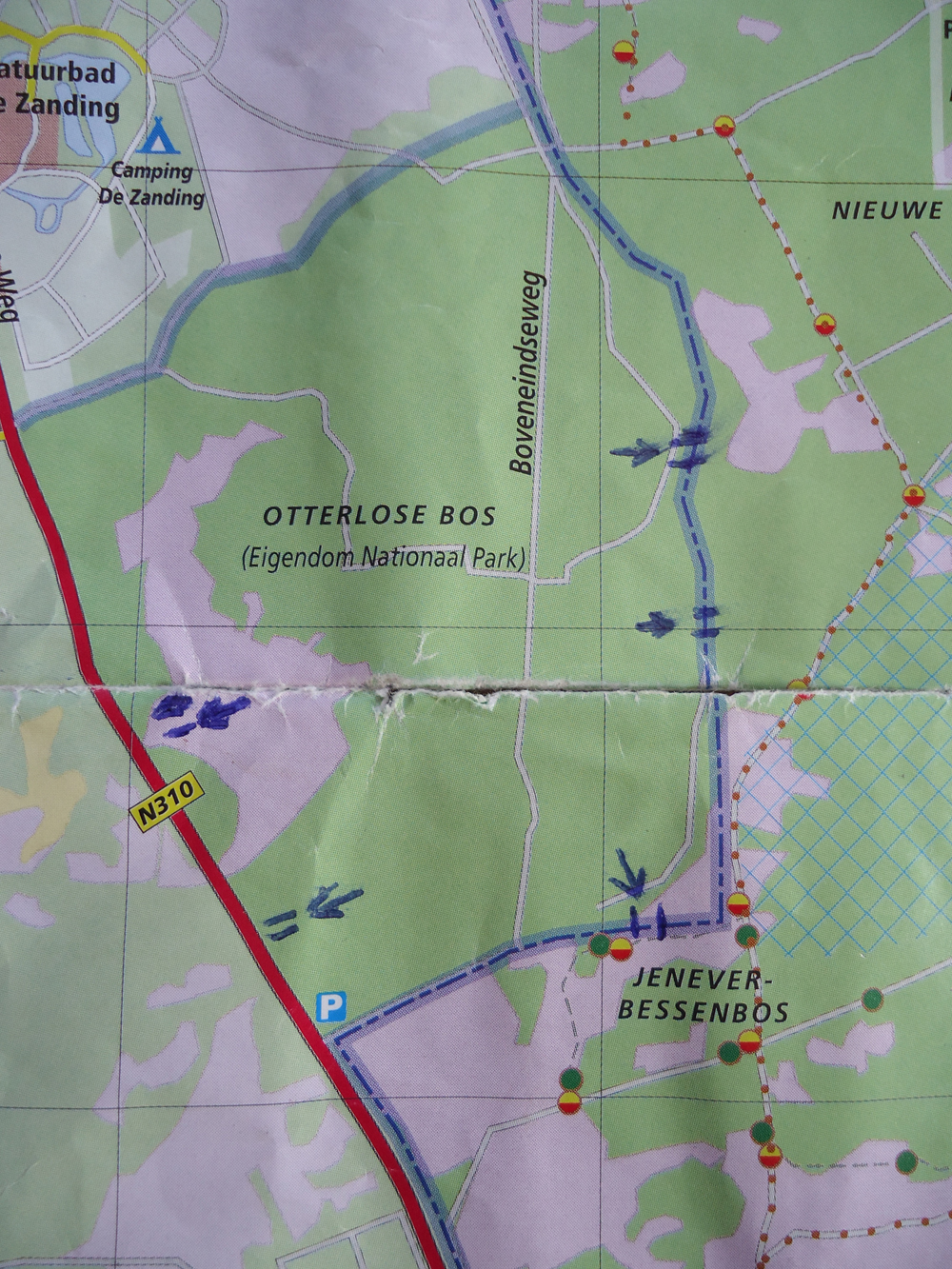 Het Otterlose Bos (foto 1) hoort bij het Nationale Park Hoge Veluwe, maar is daarvan afgescheiden door een twee meter hoog wildraster dat de ingang Boveneidseweg (aan de N310) met Ingang Otterlo verbindt. Sinds kort is dit raster eveneens verbonden met een nieuw geplaatst hekwerk langs de weg N310, dat pal tegenover de ingang naar Camping De Wije Werelt aansluit bij het hekwerk rondom Camping de Zanding. Het tussen deze camping en het wildraster van de Hoge Veluwe liggende gelijknamige bos- en heidegebied (eigenaar gemeente Ede) mist in noordwestelijke richting echter elke vorm van afrastering. Al het wild dat zich dus bevindt in het Otterlose Bos heeft ook onbelemmerde toegang tot natuurgebied De Zanding en feitelijk ook tot genoemde camping. Met deze wetenschap begon op zondag de 19e januari 2013 een zoektocht naar verborgen bewijzen van gerotzooi met de wildrasters van het nationale park.