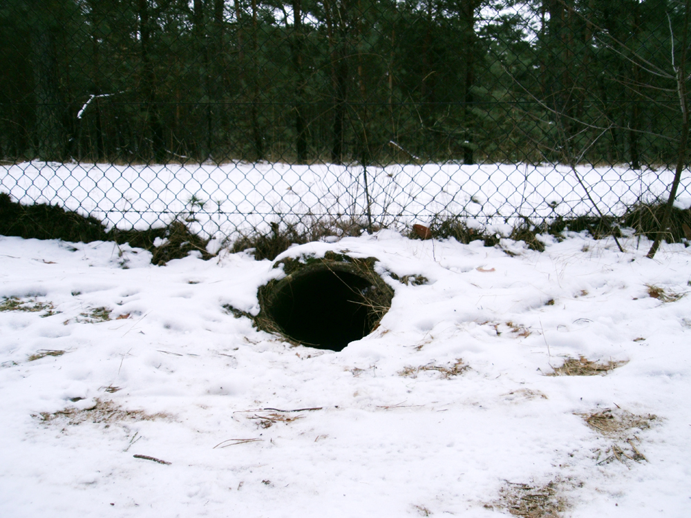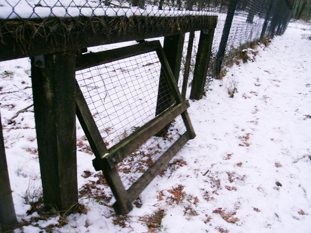 Voorlopig klaar met de Hoge Veluwe werd in een aanzwellende sneeuwstorm een vervolgscan op Landgoed Staverden uitgevoerd waar in de vorderende namiddag kon worden vastgesteld, dat er niet minder dan zes zwijnenpoortjes zijn in het noordelijke raster, dat bedoeld is om de landbouwenclave te behoeden voor wildschade. Om eentonigheid te vermijden worden hier maar van enkele van deze wildpassages foto's geplaatst. Het lijkt er op, dat deze poortjes louter ten behoeve van het zogenaamde schadeafschot door Stichting het Geldersch Landschap zijn aangebracht (foto 18, 19, 20).